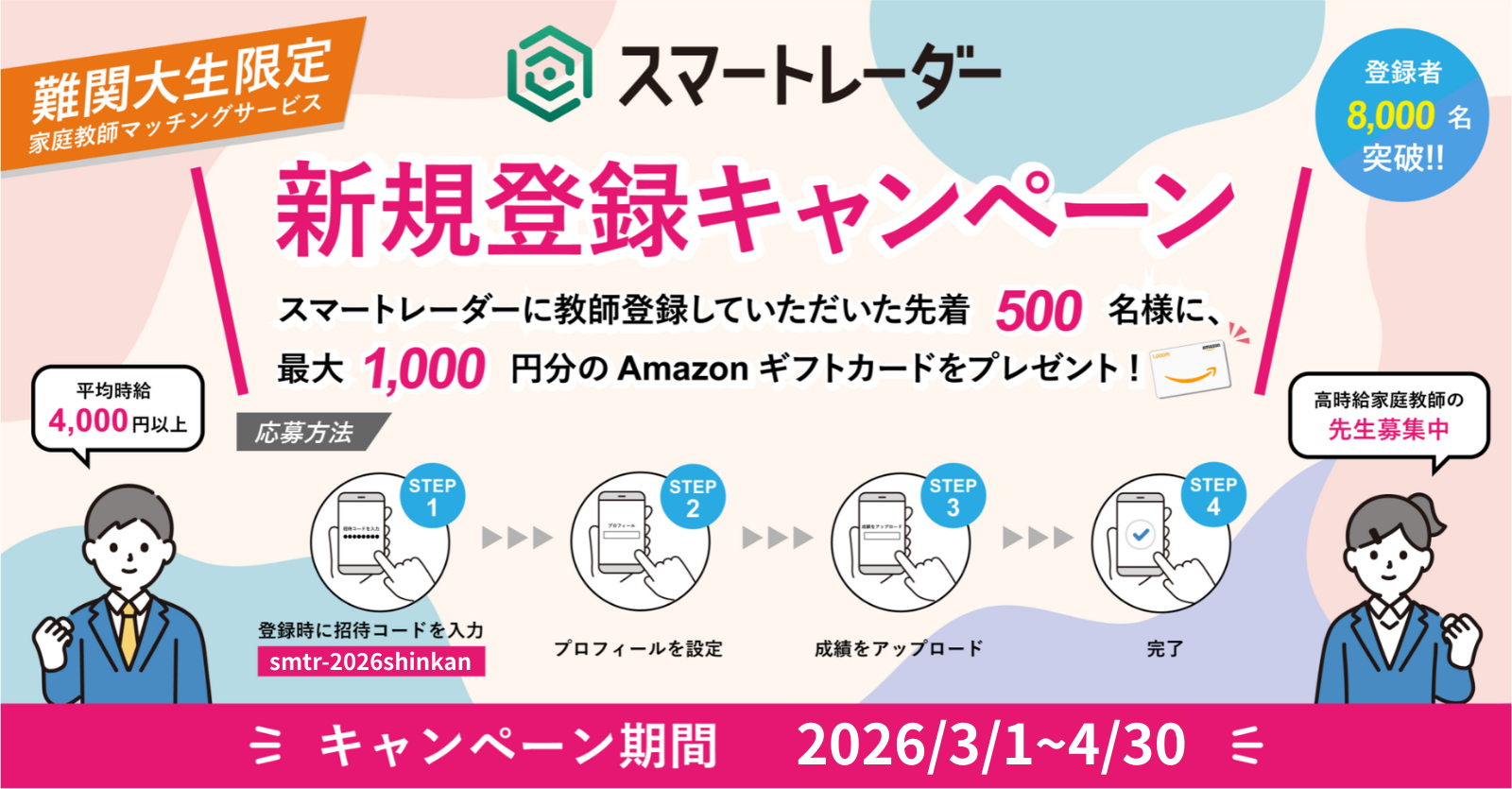 お気軽にお登録ください!スマートレーダーではご登録いただいた先生に対して、授業の契約を強制したり他サービスや他のアルバイトに関して何か制限することはありませんので、ぜひお気軽にご登録いただき、時給を見比べてみてください。早速登録して、査定を受けてみましょう